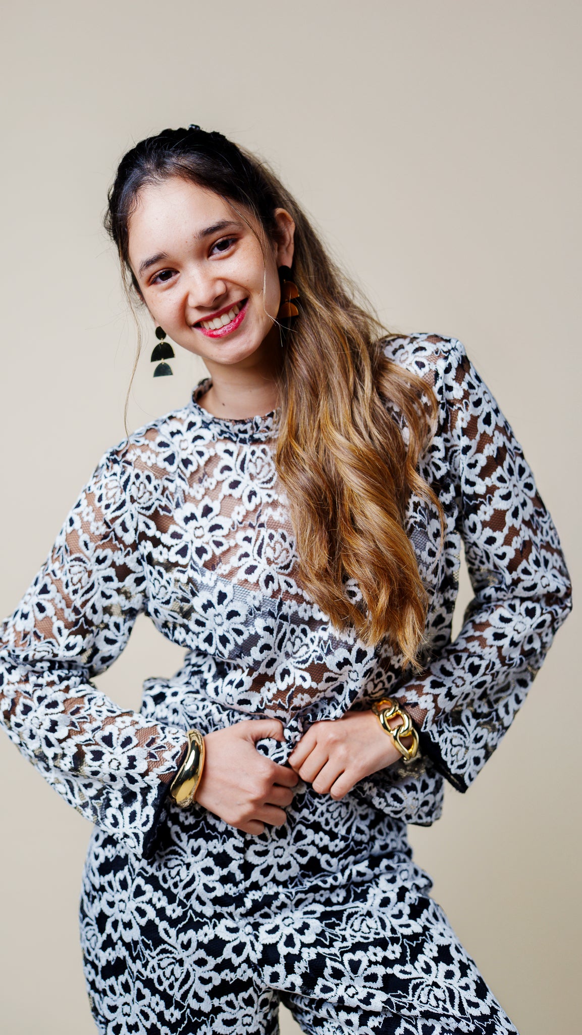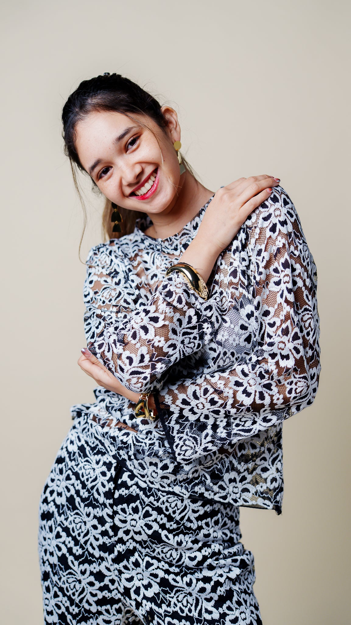 Confeccionado en un tejido de encaje floral blanco sobre base negra, este conjunto —compuesto por blusa y pantalón— juega con la transparencia, la textura y la silueta para crear una armonía entre poder y delicadeza.
