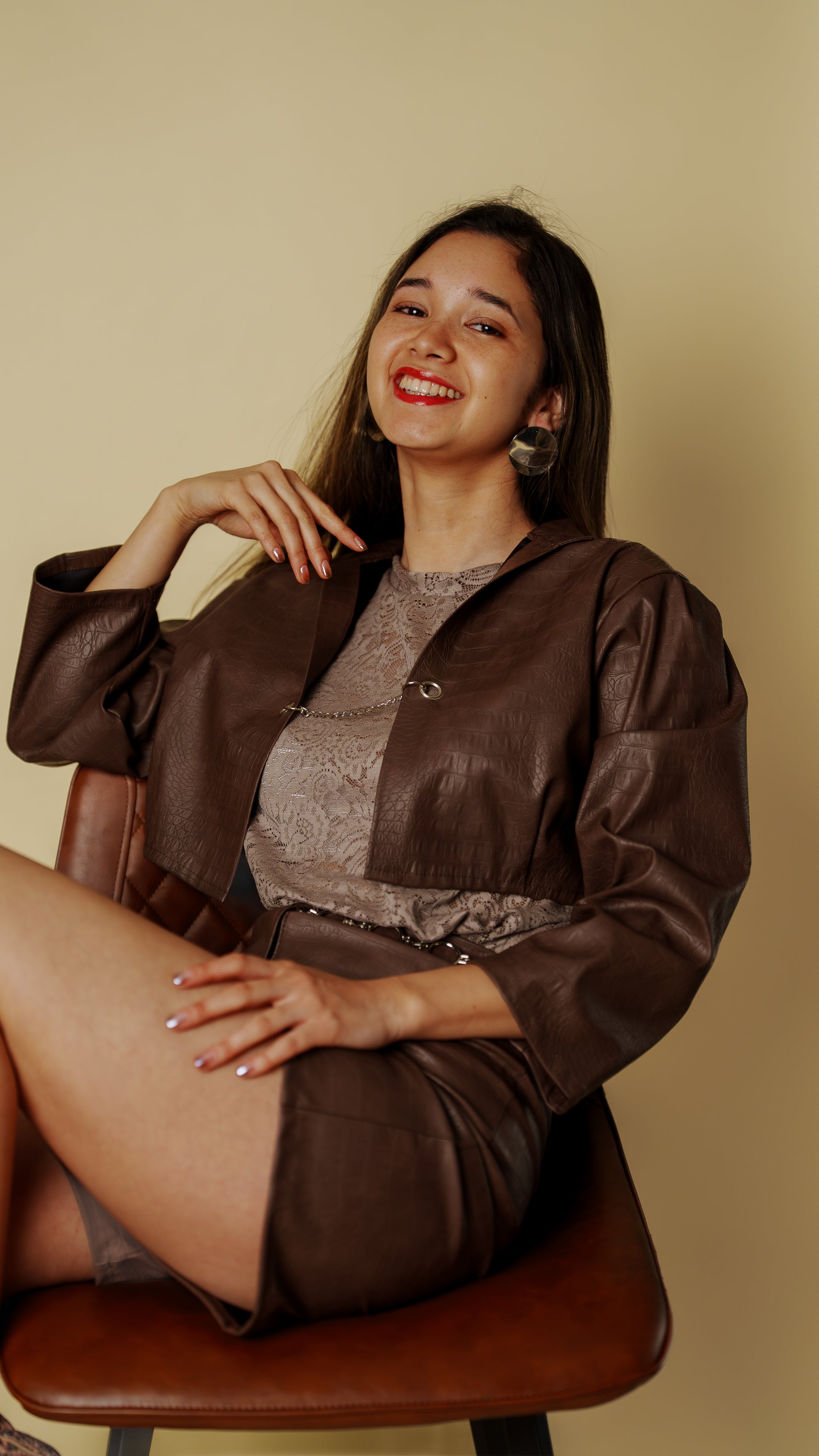 Short de tiro medio confeccionado en cuero vegano croco marrón texturizado, con un fit estructurado y fresco. Su acabado brillante y su diseño versátil lo hacen ideal para looks de día y de noche.