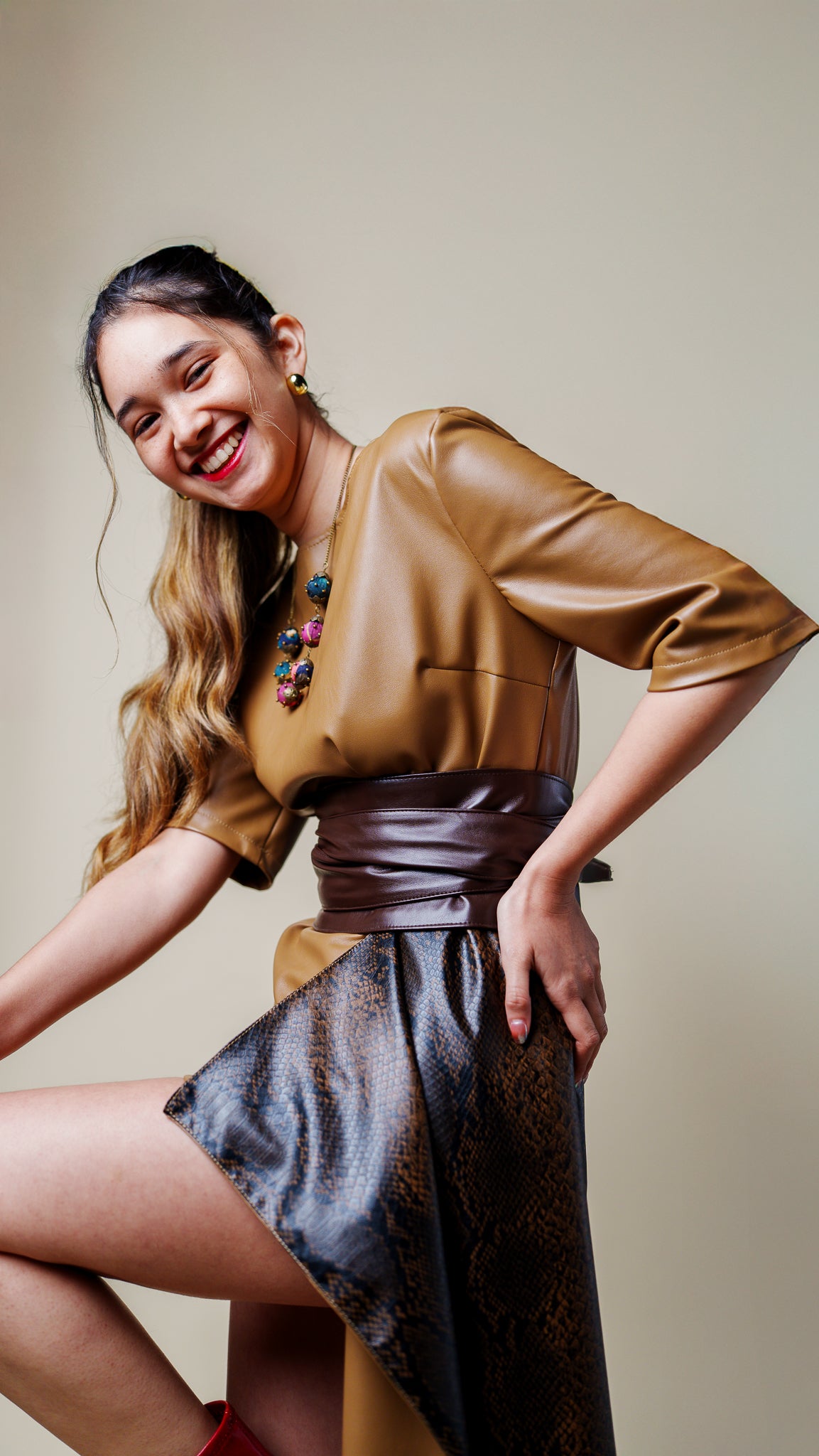Diseñado en cuero vegano color caramelo con una caída asimétrica en textura de pitón oscuro, este vestido mezcla lo clásico con lo peligroso, lo elegante con lo indomable.